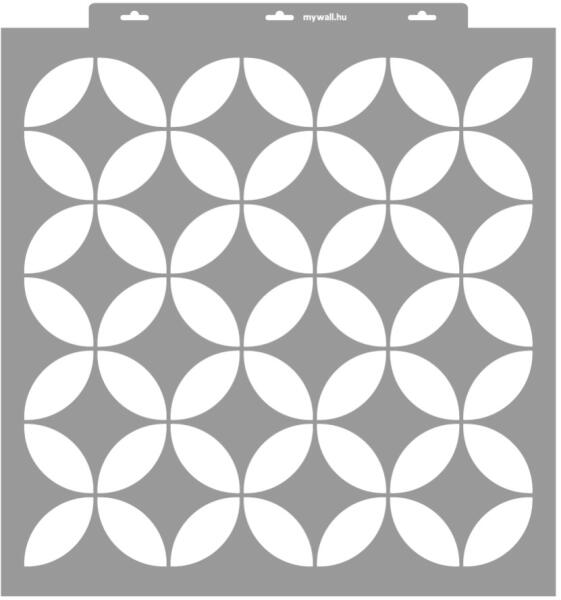 Minden irányban folytatható minta. A nagy léptékű falon, a kisebbek bútoron érvényesülnek. Tartós, többször felhasználható áttetsző, rugalmas műanyag stencil. Ívelt felületekhez is használható. Felhasználói tippek: 1. Helyezd a festeni kívánt felületre a stencilt, rögzítsd maszkolószalag segítségével. 2. Kerek stencil-ecsettel vagy szivacsecsettel körkörös mozdul