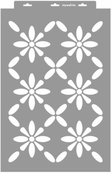 Minden irányba folytatható ez a stilizált virágmező. A 3. kép Holl Marina workshopján készült. Tartós, többször felhasználható áttetsző, rugalmas műanyag stencil. Ívelt felületekhez is használható. Felhasználói tippek: 1. Helyezd a festeni kívánt felületre a stencilt, rögzítsd maszkolószalag segítségével. 2. Kerek stencil-ecsettel vagy szivacsecsettel körkörös mo