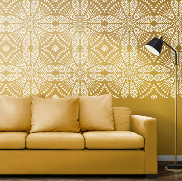 Egzotikus indiai minta. Az illesztési pontoknak köszönhetően minden irányba folytatható. Tartós, többször felhasználható áttetsző, rugalmas műanyag stencil. Ívelt felületekhez is használható. Felhasználói tippek: 1. Helyezd a festeni kívánt felületre a stencilt, rögzítsd maszkolószalag segítségével. 2. Kerek stencil-ecsettel vagy szivacsecsettel körkörös mozdulatokk