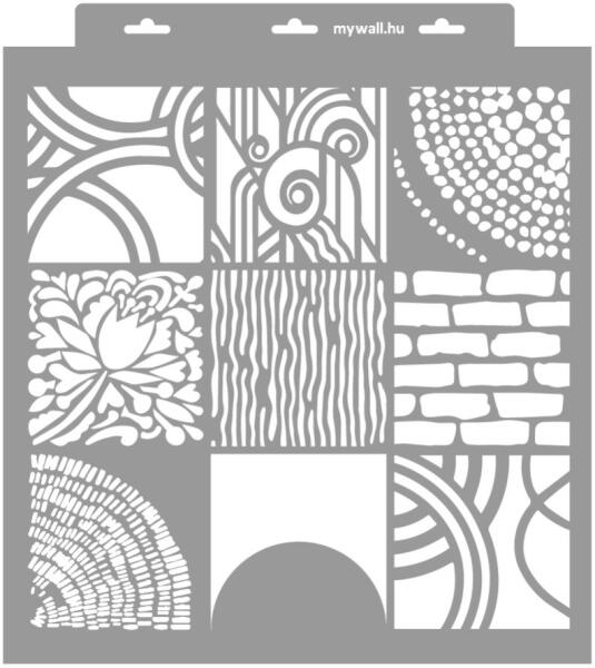 Többféle mintát kombináltam ezen stencilcsaládon egy-egy ívre. Mintái között megtalálhatóak a klasszikus és letisztult formák, de akadnak bohém, virágos minták, geometriai formák, valamint organikus és absztrakt mintázatok is. Ha vegyes, mintázott hatást szeretnél elérni a díszítés során, akkor érdemes használni. Tartós, többször felhasználható áttetsző, rugalma