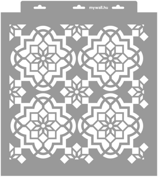 Minden irányban folytatható minta. A nagy léptékű falon, a kisebbek bútoron érvényesülnek. Tartós, többször felhasználható áttetsző, rugalmas műanyag stencil. Ívelt felületekhez is használható. Felhasználói tippek: 1. Helyezd a festeni kívánt felületre a stencilt, rögzítsd maszkolószalag segítségével. 2. Kerek stencil-ecsettel vagy szivacsecsettel körkörös mozdul