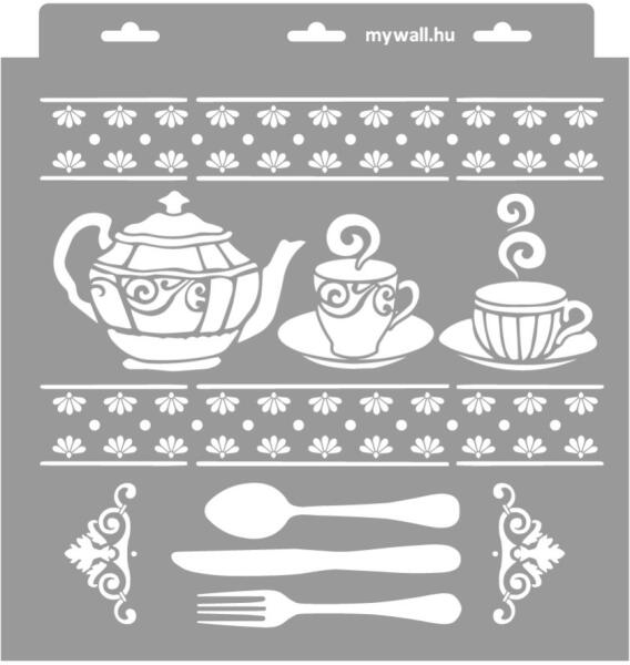 Kedves kis csészikék és teáskannák sorakoznak ezeken a stencileken. Akár teljes konyhafalon, abroszon, konyharuhán vagy kötényen használod, biztosan nagy sikere lesz. Tartós, többször felhasználható áttetsző, rugalmas műanyag stencil. Ívelt felületekhez is használható. Felhasználói tippek: 1. Helyezd a festeni kívánt felületre a stencilt, rögzítsd maszkolószalag segí