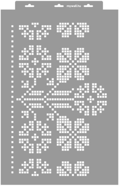 A szabolcsi keresztszemes hímzésminták egyik legszebb életfa motívumát festheted meg ezzel a stencillel. A csarodai pacsirtás falvédőhöz tartozó minta ez, de önállóan is megállja helyét. A dupla szívsor változat szőttesre emlékeztető motívum. Modern mai otthonokban is méltó tisztelettel adózhatunk ezzel az újragondolt magyar díszítőtechnikával. Festő, és 3D változa