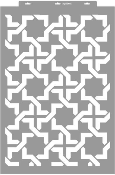 Közkedvelt marokkói stencilminta. Izgalmas, áttört hatású felületet képezhetsz vele bármely felületen. 3D változatban (350 mikron vastag) is kérheted, mellyel tudsz festeni, és plasztikus mintázatot is tudsz képezni. Tartós, többször felhasználható áttetsző, rugalmas műanyag stencil. Ívelt felületekhez is használható. Felhasználói tippek: 1. Helyezd a festeni kívánt