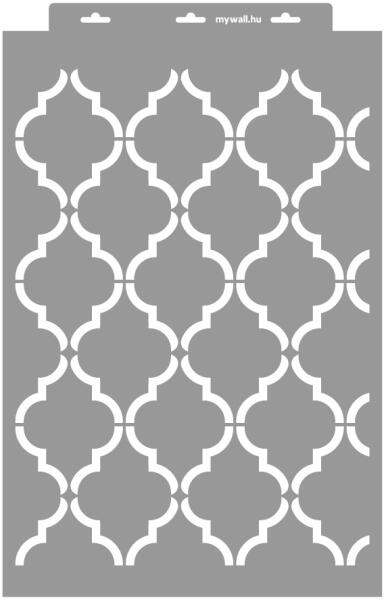 Klasszikus marokkói stencil minta. Izgalmas áttört hatású felületet képezhetsz vele bármilyen felületen. Tartós, többször felhasználható áttetsző, rugalmas műanyag stencil. Ívelt felületekhez is használható. Felhasználói tippek: 1. Helyezd a festeni kívánt felületre a stencilt, rögzítsd maszkolószalag segítségével. 2. Kerek stencil-ecsettel vagy szivacsecsettel kör