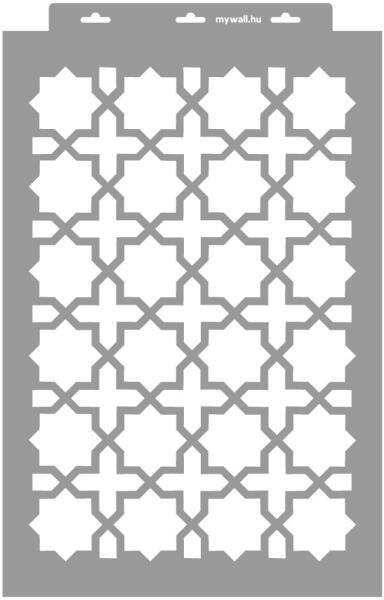 Közkedvelt marokkói stencilminta. Izgalmas, áttört hatású felületet képezhetsz vele bármely felületen. 3D változatban (350 mikron vastag) is kérheted, mellyel tudsz festeni, és plasztikus mintázatot is tudsz képezni. Tartós, többször felhasználható áttetsző, rugalmas műanyag stencil. Ívelt felületekhez is használható. Felhasználói tippek: 1. Helyezd a festeni kívánt
