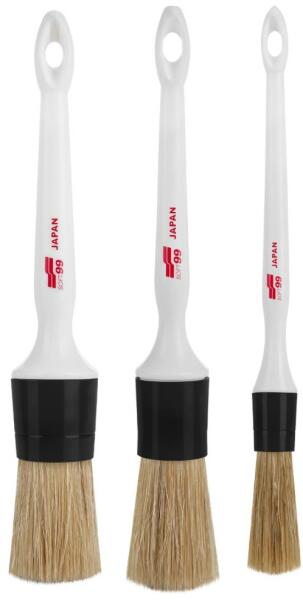 Soft99 Ecset Készlet 3db-os 16mm 24mm 30mm Profi használatra tervezett ecsetkészlet, a Soft99-től. Kiválóan alkalmasak felnik, küszöbök, ajtómélyedések és a motortér tisztítására. Használhatók a legsúlyosabb szennyeződés eltávolítására a jármű belsejéből. A kefék nem alkalmasak a karcolásra hajlamos elemek tisztítására, például a zongoralakk elemeknél. Az ecse