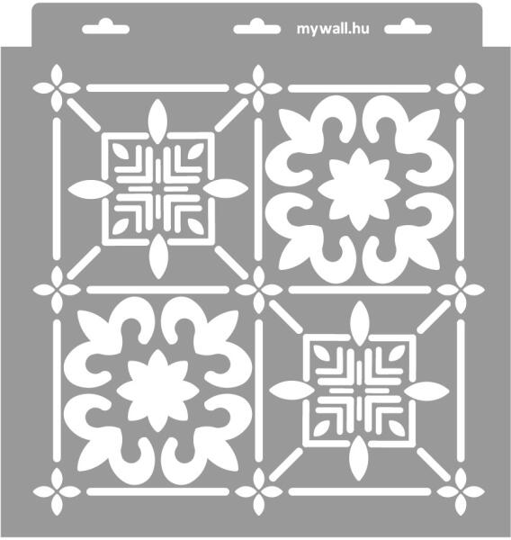 Különleges csempeminta azoknak, akik szeretnek eltérni a megszokottól. Ennek a stencilnek egyedi bája az afrikai motívumok játéka. Tartós, többször felhasználható áttetsző, rugalmas műanyag stencil. Ívelt felületekhez is használható. Felhasználói tippek: 1. Helyezd a festeni kívánt felületre a stencilt, rögzítsd maszkolószalag segítségével. 2. Kerek stencil-ecsettel