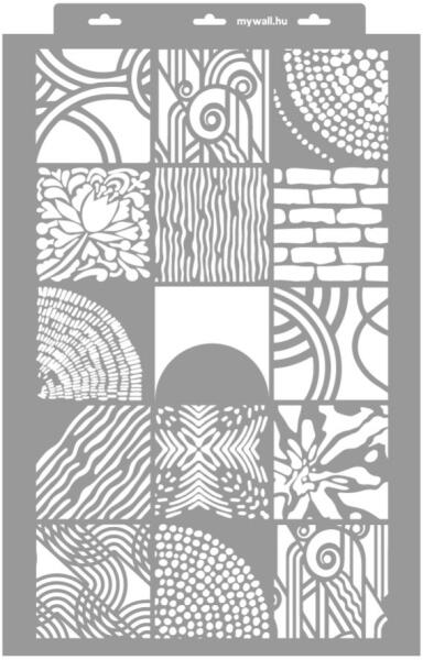 Többféle mintát kombináltam ezen stencilcsaládon egy-egy ívre. Mintái között megtalálhatóak a klasszikus és letisztult formák, de akadnak bohém, virágos minták, geometriai formák, valamint organikus és absztrakt mintázatok is. Ha vegyes, mintázott hatást szeretnél elérni a díszítés során, akkor érdemes használni. Tartós, többször felhasználható áttetsző, rugalma