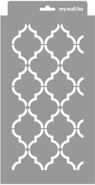 Klasszikus marokkói stencil minta. Izgalmas áttört hatású felületet képezhetsz vele bármilyen felületen. Tartós, többször felhasználható áttetsző, rugalmas műanyag stencil. Ívelt felületekhez is használható. Felhasználói tippek: 1. Helyezd a festeni kívánt felületre a stencilt, rögzítsd maszkolószalag segítségével. 2. Kerek stencil-ecsettel vagy szivacsecsettel kör