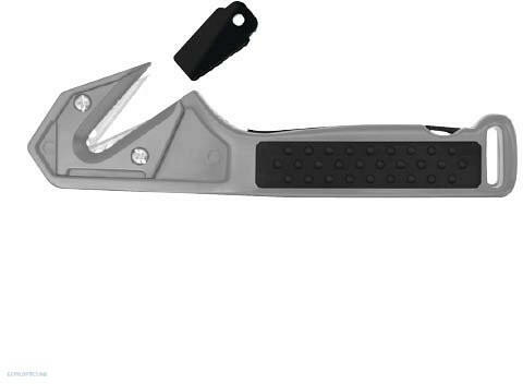 Fóliahegesztett raklapok és gépjármű biztonsági övek kinyitására, erős fóliák, kartondobozok műanyag kötözőinek elvágására. Puha nyél. Felfüggesztésre szolgáló eszközzel és védőkupakkal. Tömeg: 125 g 5 év garancia. Szín: szürke/fekete 1 dupla penge .