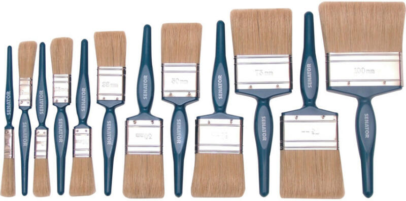 Festett fanyéllel. Krómozott fémlemez szorítópánt. Hosszú, tiszta sörteszálak. 12 darabos készlet - 1 x 19, 38, 63 és 100 mm-es, 2 x 13, 25, 50 és 75 mm-es ecsetek.