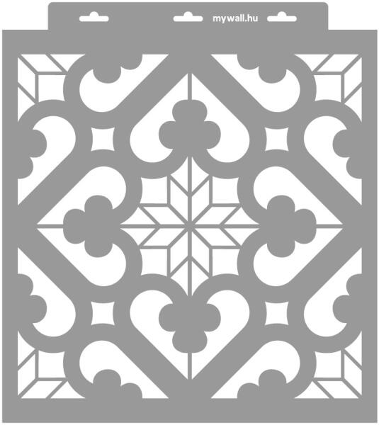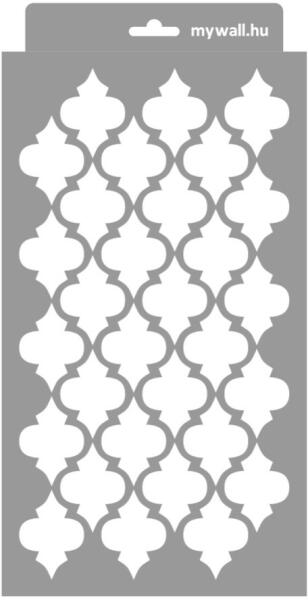 Ennél a marokkói mintánál a fal alapszíne adja a rácsvonalakat. A minta minden irányban folytatható. A nagy léptékűek falon, a kisebbek bútoron érvényesülnek leginkább. Tartós, többször felhasználható áttetsző, rugalmas műanyag stencil. Ívelt felületekhez is használható. Felhasználói tippek: 1. Helyezd a festeni kívánt felületre a stencilt, rögzítsd maszkolószal