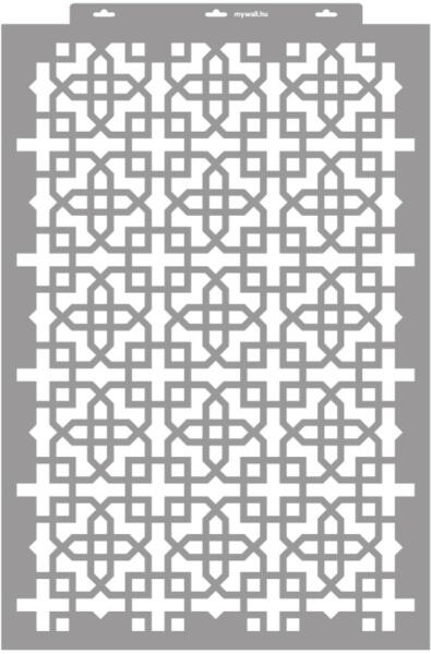 Minden irányban folytatható klasszikus marokkói rácsminta. Dekorfal készítéséhez használd a 3D változatot. Tartós, többször felhasználható áttetsző, rugalmas műanyag stencil. Ívelt felületekhez is használható. Felhasználói tippek: 1. Helyezd a festeni kívánt felületre a stencilt, rögzítsd maszkolószalag segítségével. 2. Kerek stencil-ecsettel vagy szivacsecsettel k