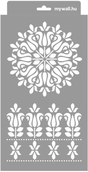 Mandala, de most magyaros motívumokkal körítve. Szakítunk a megszokottal, és a keleti mandalák helyett, rendhagyó módon bemutatjuk ezt a matyó tulipánokkal díszített mandala stencilt. Fedezd fel a tradíciók és a modern stílus egyedülálló keverékét ebben az egyedi mintában! Tartós, többször felhasználható áttetsző, rugalmas műanyag stencil. Ívelt felületekhez is hasz