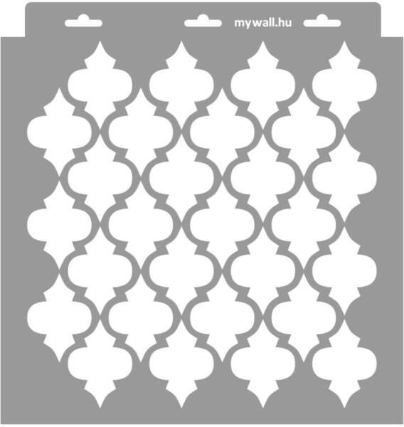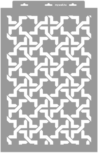 Ennél a marokkói mintánál a fal alapszíne adja a rácsvonalakat. A minta minden irányban folytatható. A nagy léptékűek falon, a kisebbek bútoron érvényesülnek leginkább. Tartós, többször felhasználható áttetsző, rugalmas műanyag stencil. Ívelt felületekhez is használható. Felhasználói tippek: 1. Helyezd a festeni kívánt felületre a stencilt, rögzítsd maszkolószal