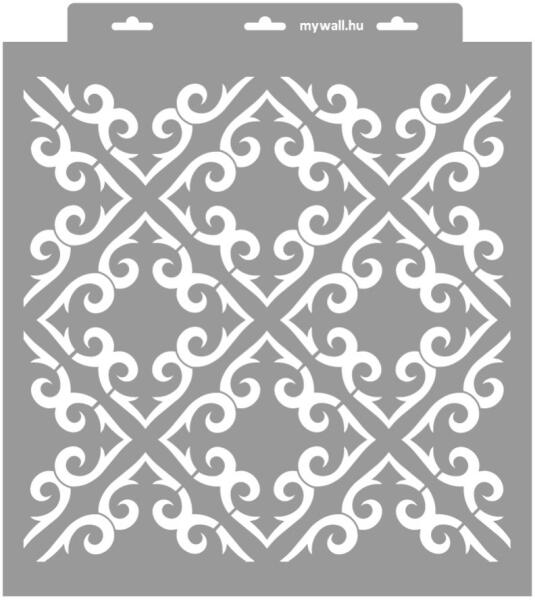 Modern enteriőrök díszítő eleme. Kovácsoltvas hatású stencil. 3D változatban (350 mikron vastag) is kérheted, mellyel tudsz festeni, és plasztikus mintázatot is tudsz képezni. Tartós, többször felhasználható áttetsző, rugalmas műanyag stencil. Ívelt felületekhez is használható. Felhasználói tippek: 1. Helyezd a festeni kívánt felületre a stencilt, rögzítsd maszkoló
