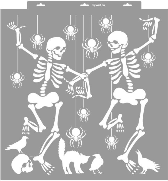 Plafonról lógó pókok és táncoló csontvázak. Ezeken a stencileken minden megvan, ami egy igazán rémisztő Halloweenhez kell. Tartós, többször felhasználható áttetsző, rugalmas műanyag stencil. Ívelt felületekhez is használható. Felhasználói tippek: 1. Helyezd a festeni kívánt felületre a stencilt, rögzítsd maszkolószalag segítségével. 2. Kerek stencil-ecsettel vagy