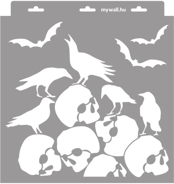 Egy rakás emberi koponya, a kupac tetején károgó varjakkal. Mi is lehetne félelmetesebb. Használd ezt a stencilmintát Halloween-i, vagy vad gót stílusú dekorációkhoz. Tartós, többször felhasználható áttetsző, rugalmas műanyag stencil. Ívelt felületekhez is használható. Felhasználói tippek: 1. Helyezd a festeni kívánt felületre a stencilt, rögzítsd maszkolószalag seg