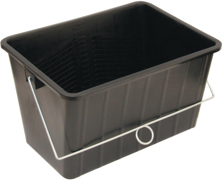 Fekete műanyag festővödör fém füllel és peremmel a festőhenger rögzítéséhez. Súly: 825 g