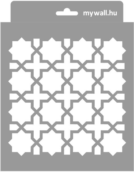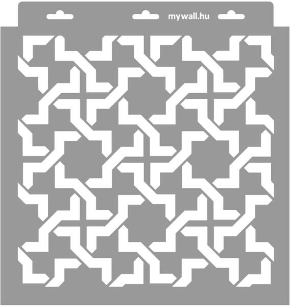 Közkedvelt marokkói stencilminta. Izgalmas, áttört hatású felületet képezhetsz vele bármely felületen. 3D változatban (350 mikron vastag) is kérheted, mellyel tudsz festeni, és plasztikus mintázatot is tudsz képezni. Tartós, többször felhasználható áttetsző, rugalmas műanyag stencil. Ívelt felületekhez is használható. Felhasználói tippek: 1. Helyezd a festeni kívánt