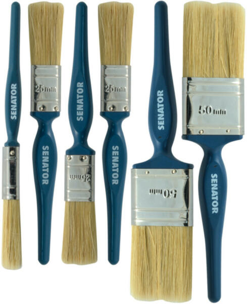 Festett fanyéllel. Krómozott fémlemez szorítópánt. Hosszú, tiszta sörteszálak. 6 darabos készlet - 1 x 13 mm, 3 x 25 és 2 x 50 mm-es ecsetek.