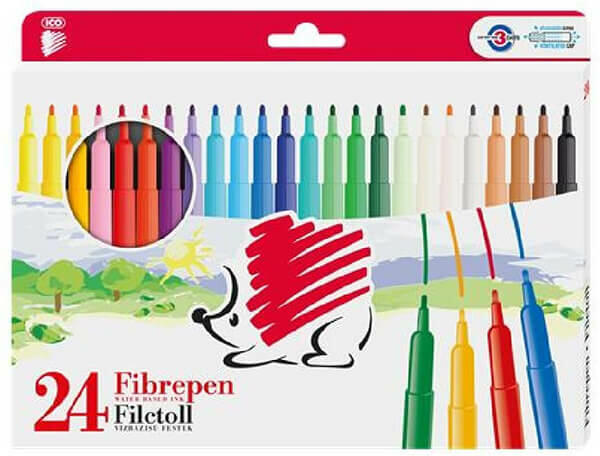 ICO 300-as 24 színű általános használatú filctoll / rostiron írásra, rajzolásra, színezésre vízbázisú festékkel töltve A filctollak színe fantasztikus élénkek. Rendetlenebb gyerkőcöknek további kellemes tulajdonsága hogy a kupak nélkül is kibírja akár 3 napig beszáradás nélkül. Strapabíró hegy. Vonalvastagság: 1 mm. Jellemzői: - 24 darabos filctoll készlet - Ví