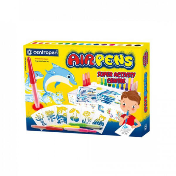 Filctoll fújós készlet Centropen AIRPENS 1500 Super Activity 15 klf. szín Papírra való használatra ajánlott. Órákig tartó nagyszerű szórakozást nyújt, 3 éves kor felett ideális ajándékötlet bárkinek. A vízbázisú tinta lemosható, 60°-on kimosható és egészségre ártalmatlan, 100%-ban biztonságos a gyermekek egészsége szempontjából. A festék egyenletesen kenhető,