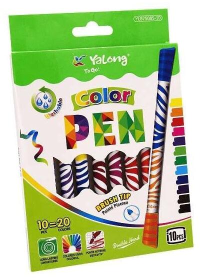 Yalong márkájú 10 darab kétvégű filctoll készlet, mely így 20 színű. Közepes hegyes hegy. Filctoll vastagsága 1 cm. Szép élénk színek. Erős fedőképesség. Mérgező anyagot nem tartalmaz. Gördülékenyen és kényelmesen használható. Legtöbb textilből kimosható. Remek ár - érték arányú termék.