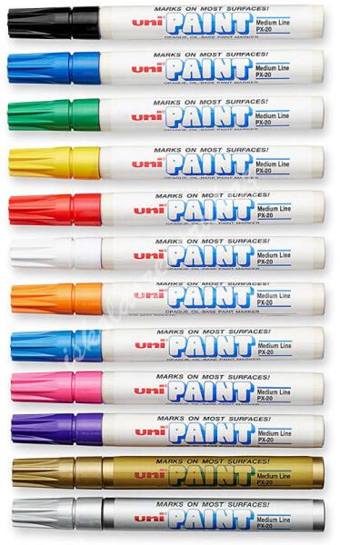 Uni lakkfilc 13 színben közepes vastagságú hegy 2.2-2.8 mm minden felületen használható alkoholbázisú lakkfilc A "Választható színek"-re kattintva tudsz színt választani.