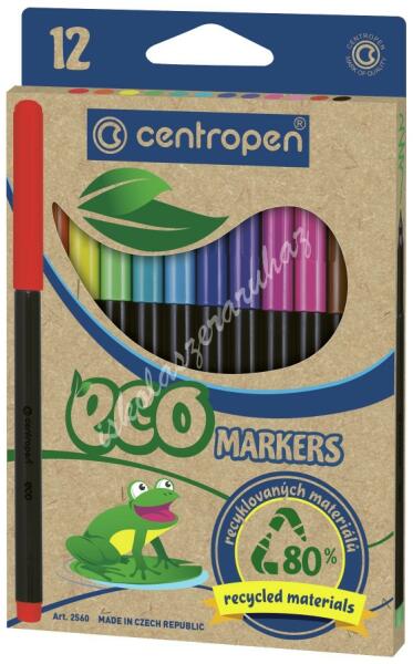 Centropen filctoll készlet 12 darabos készlet kerek filctoll test élénk színek száradás után 5 évig nem veszít a fényéből könnyedén lemosható, kimosható 1 mm vastag vonal 80%-ban újrahasznosított anyagokból készült