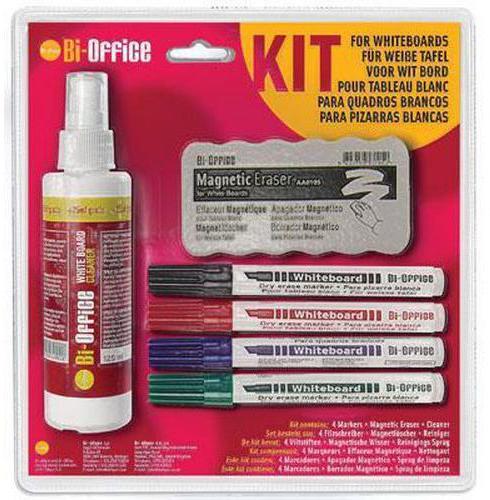 A Bi-Office készlet fehér táblákhoz négy különböző színű irónt, egy mágneses törlőszivacsot és 125 ml tisztító folyadékot tartalmaz.