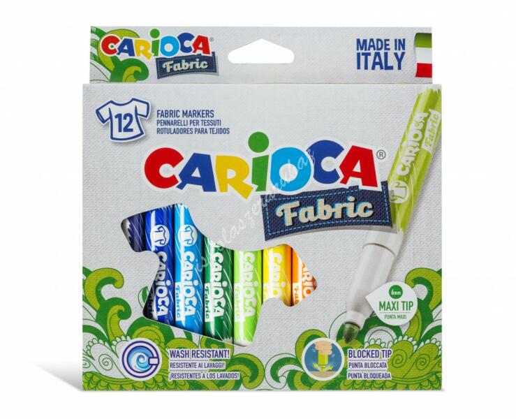 Carioca textilfilc készlet 12 darabos készlet 6mm vastag csúccsal ami benyomódás elleni védelemmel van ellátva Nem tartalmaz mérgező anyagot Miután felrajzoltuk a mintát a textiliára, fordítsuk ki az anyagot majd vasalóval fixáljuk azt. Fixálás után nyugodtan mosható mosógépben maximum 60 fokon. A következő színeket tartalmazza: szürke lila kék világos kék sötét zöld