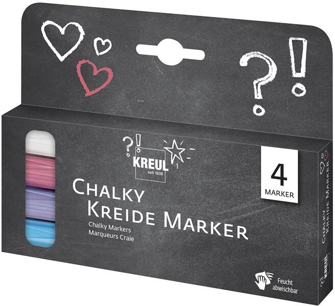 Kréta marker készlet KREUL - 4db Kréta marker készlet KREUL speciális filctollakat tartalmaz, amelyeket a klasszikus táblakrétához hasonlóan használhatunk. A marker innovatív rendszere abban rejlik, hogy használata után kezei tiszták maradnak. A marker matt, nem permanens folyékony krétát tartalmaz, mely vízalapú. A használt anyagok legalább 60%-ka fenntartható és növényi