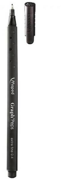 MAPED Graph Peps háromszögletű, fekete tűfilce a vékony és pontos íráshoz. Vonalvastagság: 0,4 mm. Tökéletes akár rajzok részleteinek a kiemeléséhez, akár a műszaki rajzoknál is hasznát veheted. Vízbázisú festékkel van töltve. A rozsdamentes hegy folyamatos írásképet eredményez. Háromszög forma a kényelmes fogást, írást biztosítja. Fekete, műanyag tolltest.