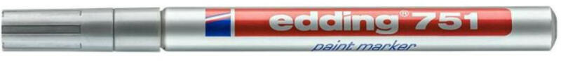 Edding lakkmarkerTípus: "751"Vonalvastagság: 1-2 mm, kerek hegy Szín: ezüstFelhasználás: üveg, porcelán, műanyag, fém, illetve szinte minden felület feliratozására alkalmas Edding lakkmarker "751" 1-2 mm ezüst Különösen alkalmas sötét és átlátszó felületekre, víz és fényálló, nagyon erősen kopásálló, 400°C-ig hőálló.