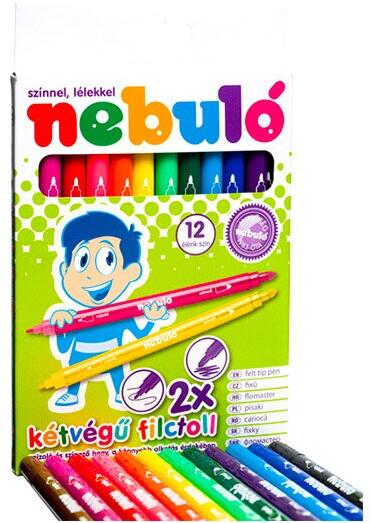 Nebuló kétvégű filctoll készlet. A filctollak egyik vége vékonyan fog, a másik pedig vastagon. A csomagolás 12 db filctollat tartalmaz különböző színekben.