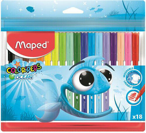 MAPED márkájú 18 színes filctoll ruhából könnyen kimosható, vízbázisú tintával. Közepes vonalvastagságú hegy, amely alkalmas rajzolásra, vagy színezésre. Háromszög alakú, ergonomikus kialakítás a fogórésznél. Nyomásnak ellenálló hegy. Vonalvastagság: 2,0 mm.