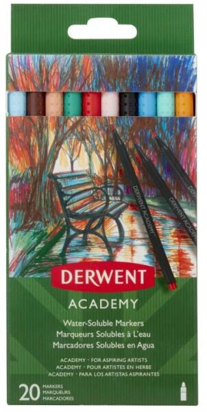 Derwent Academy akvarell filctoll készlet, 20 dbA Derwent Academy kétvégű filctollak alkalmasak finom, precíz rajzok készítésére vagy sok szín gyors felvitelére. Az ecset vég egyszerre képes vastag és vékony vonalat is húzni egy vonással. A finom hegynek széles pereme és finom hegye van a precíz vezetés érdekében. Olyan különféle technikák sajátíthatók el vele, mint a