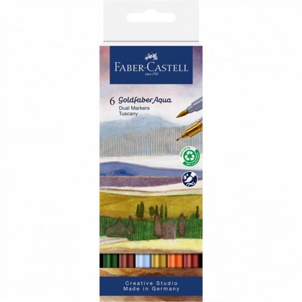 Akvarell markerek Goldfaber Aqua Dual szett Tuscany | 6 db Az Aqua Dual markerek sokoldalúak, két terméket egyesítenek egyben. Az akvarell filctollak jól illeszkednek a kézbe, kerekek, markolat nélkül. A filctoll ideális íráshoz, vázlatkészítéshez, rajzoláshoz vagy festéshez. Az élénk színek vízzel hígíthatóak, és gyönyörű akvarellhatást hoznak létre. A Goldfaber egy