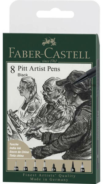 Pigmentált India tinta. Magas fényállóság. Rugalmas ecset hegy, megtartja a formáját. Vízálló, tartós. Szagtalan, savmentes és pH semleges. Nem üt át papíron. 8db-os készlet. Vonalvastagság: XXS;S;F;M;1,5mm;C;B;FH