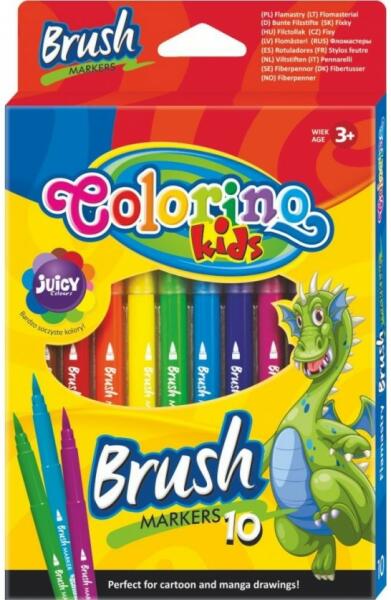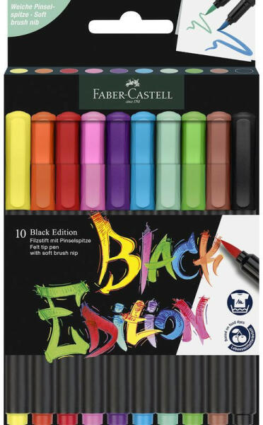 Filctoll készlet 10db-os Black Edition fekete testű Szórakoztató színezés ecset hegyű tollal Termékleírás: - puha ecsetfejű filctoll - lágy, ragyogó színek - ideális kisméretű rajzoláshoz színezéshez - a vonalvastagság egyszerűen változtatható a toll használata során - a legtöbb textíliából könnyen kimosható - élelmiszerfesték alapú tinta