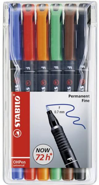 Stabilo OHPen universal F alkoholos filctoll szett 6db-os Hivatalos magyarországi forgalmazótól. Leírás: Rendkívül hosszú élettartammal rendelkeznek ezek a kiváló minőségű filcek, melyekből összesen hat különböző szín található a szettben. A Stabilo OHPen universal filctollak alkoholos bázisú tintával töltöttek, ezáltal tartós vonalakat hagynak maguk után a sima fel