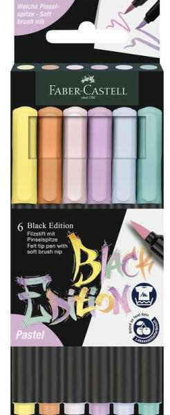 Filctoll készlet 6db-os Black Edition fekete testű Pasztell színek Szórakoztató színezés ecset hegyű tollal Termékleírás: - puha ecsetfejű filctoll - lágy, ragyogó színek - ideális kisméretű rajzoláshoz színezéshez - a vonalvastagság egyszerűen változtatható a toll használata során - a legtöbb textíliából könnyen kimosható - élelmiszerfesték alapú tinta
