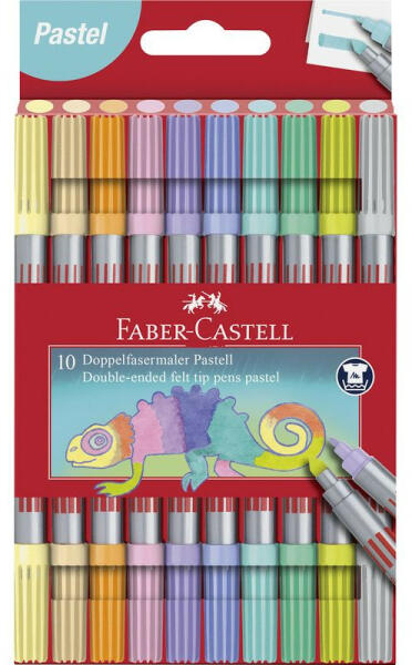 Minőségi filctoll készlet a Faber-Castelltől!A Faber-Castell kétvégű filctoll készletével kicsik és nagyok színesebbnél színesebb képeket rajzolhatnak. A dobozban 10 darab gyönyörű, pasztell színnel fogó filctoll kapott helyet, amelyek egyik végén vékony, akár kontúrozásra is alkalmas, másik végén pedig vastagabb hegy kapott helyet, amely tökéletesen alkalmas színez