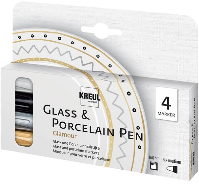 Filctoll készlet üveg és porcelán festésre KREUL Glamour - 4 db A filctoll készlet üveg és porcelán festésre KREUL a Glamour sorozatból speciális filctollakból áll, amelyeket üveg, porcelán és fémtárgyak rajzolására, festésére és írására tervezték. Használatával csillogást, fényt és eleganciát érhet el, és egyedülálló egyediséget adhat a régi, mindennapi te