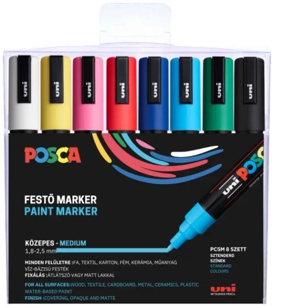 Uni Posca Filctoll PC-5M 8db-os készlet (Fehér, sárga, rózsaszín, piros, kék, világoskék, zöld, fekete)Posca egy rendkívül sokoldalú dekormarker. Írásra, rajzolásra, festésre, jelölésre, díszítésre, hobbi tevékenységekhez használható. Műanyagtól kezdve a fém, textil, fa, bőr felületeken is alkalmazható, de az üveg felületeken is kiválóan tapad. Nem üt át a pap
