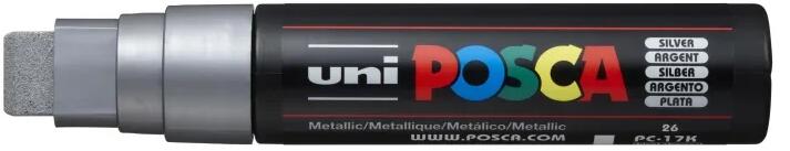 Uni Posca PC-17K EzüstPosca egy rendkívül sokoldalú dekormarker. Írásra, rajzolásra, festésre, jelölésre, díszítésre, hobbi tevékenységekhez használható. Műanyagtól kezdve a fém, textil, fa, bőr felületeken is alkalmazható, de az üveg felületeken is kiválóan tapad. Nem üt át a papíron, oldószermentes és szagtalan vízbázisú festéket tartalmaz. Száradás előtt v