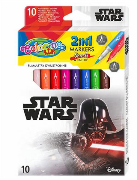 Star Wars kollekció fiúknak, a Colorinotól! 10/20 kétvégű színes filctoll készlet, melynek az egyik vége ecsetvégű, másik vége normál. Színezésre, rajzolásra egyaránt alkalmas. Szép színek. A filctollak teste Star Wars motívumokkal díszített.