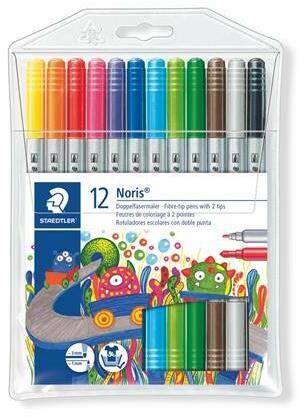 Filctoll készlet, 1-3 mm, kétvégű, kimosható, Staedtler Noris 320, 12 szín/készlet Filctoll készlet, 1-3 mm, kétvégű, kimosható, Staedtler Noris 320, 12 szín/készlet - stabil, nyomásálló hegy - szellőző kupak - PP tolltest a hosszú élettartamért - a legtöbb textilből könnyen kimosható - a vékony oldalával húzható vonalvastagság: 1 mm - a vastag oldalával húzható v